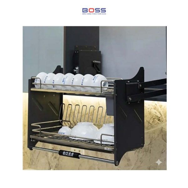 Với thiết kế này giúp giá bát luôn ổn định, giữ cho bát đĩa không bị xê dịch khi nâng lên hạ xuống. Điều này đặc biệt quan trọng đối với những gia đình có nhu cầu sử dụng giá bát đĩa thường xuyên và lưu trữ nhiều vật dụng nhà bếp.