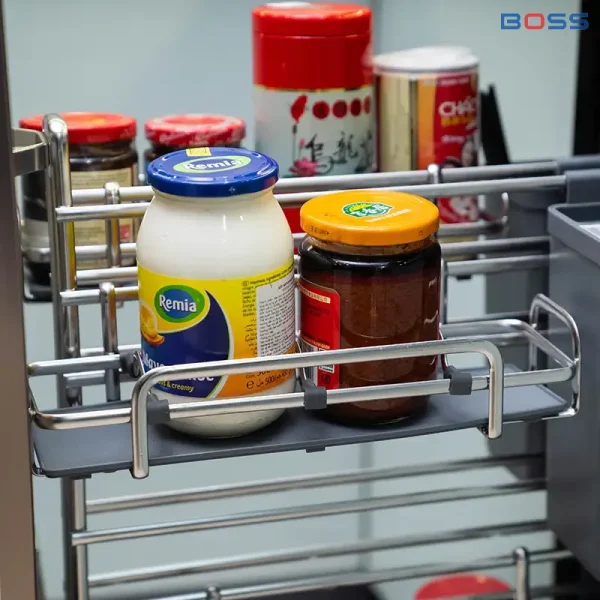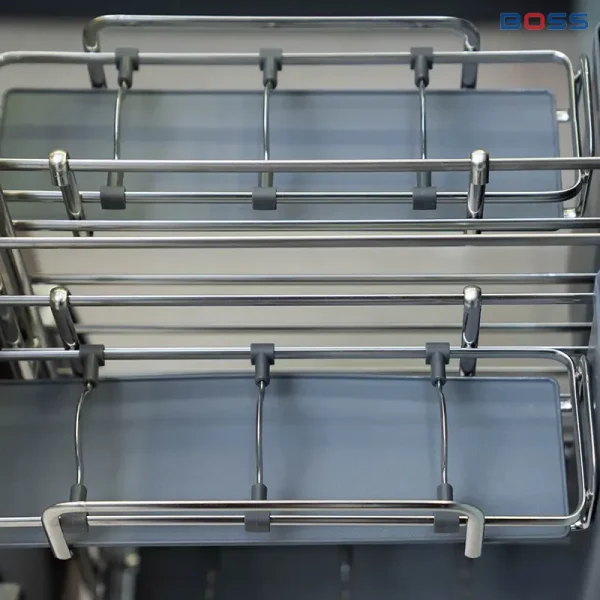 Một trong những điểm nổi bật của giá dao thớt nan oval là hệ thống ray âm giảm chấn. Đây là loại ray trượt cao cấp giúp bạn kéo ra, đẩy vào dễ dàng mà không gây ra tiếng ồn. Hệ thống giảm chấn còn giúp bảo vệ sản phẩm, tránh tình trạng va đập mạnh khi sử dụng, từ đó tăng tuổi thọ cho giá dao thớt.